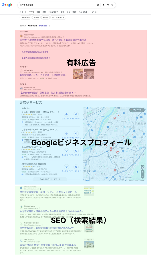 有料広告は広告費を払っているため、一番上位に表示されます。(業種によって表示は異なります。)お店を探している人が検索するキーワードで検索された場合、検索結果の二番目に表示されているのが、このGoogleマップです。